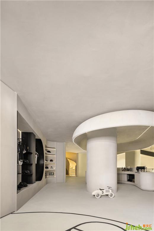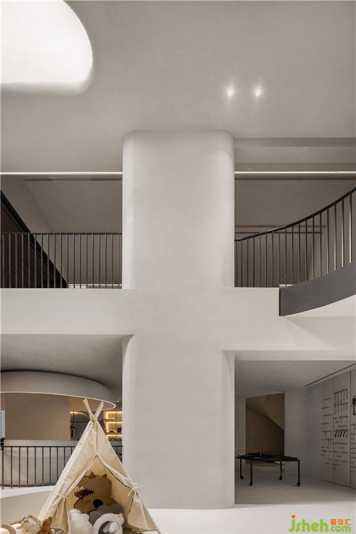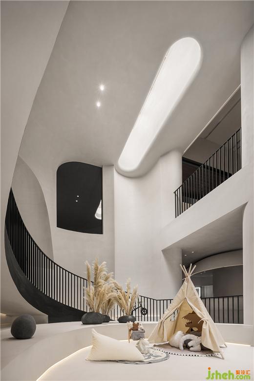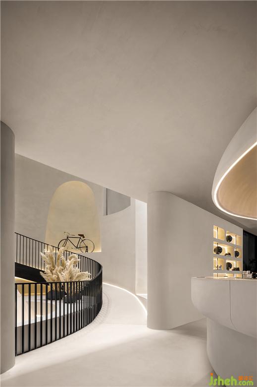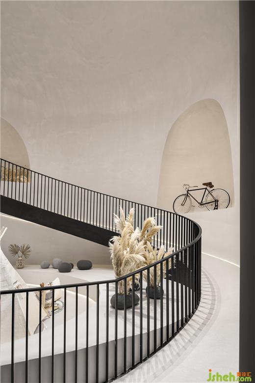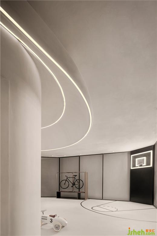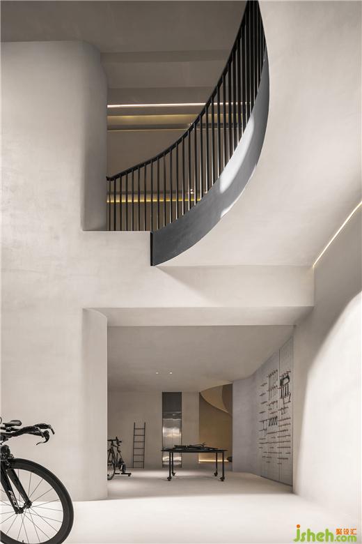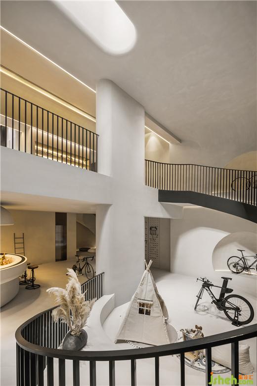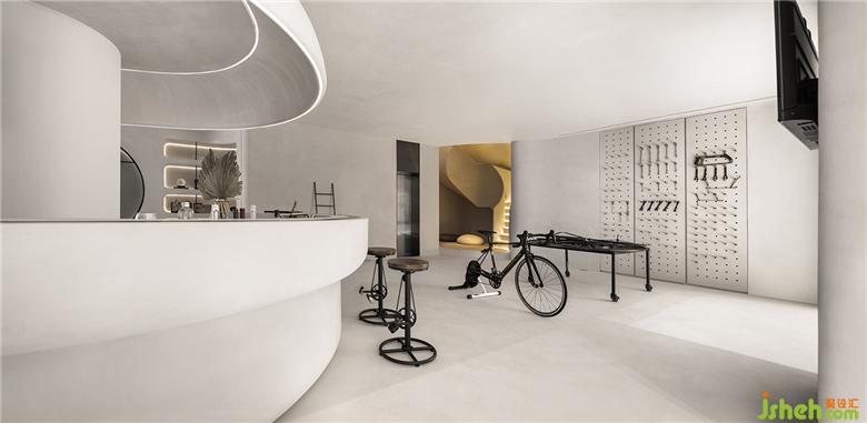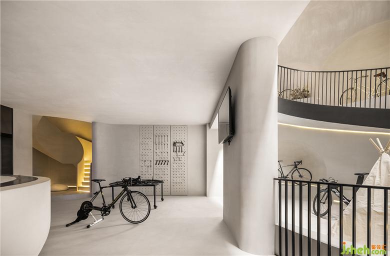 二是地下层为侘寂美学与动态物件的突破穿梭,样板间设计环形的空间动线,创造出空间的动态感,弧形楼梯、自行车坡道垂直动线连结地下层空间。从地上层方正的楼梯,走到地下层椭圆形的楼梯,从刚硬的线条转换到圆润有机的形体,放慢步伐,走进探索的道路,以自行车道为主题,车道的侧墙有如山洞般的凹洞造型,增加空间有机感,天井光影撒下,强化空间的仪式感,地下层空间主要以珪藻土涂料为主,墙面纹路的手感,从视觉到触觉的感受,享受寂静间旋律节奏的变化,线性的灯光延伸整体视觉线条,地下一层天井墙面内退,创造出阳台的过度空间,将光影延伸蔓延。地下二层的运动吧台与自行车展示空间,利用弧形吧台链接,让视觉互相链接,互动相互接连。