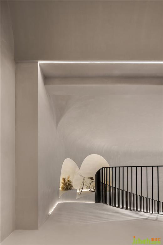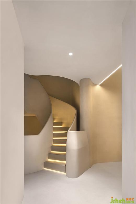 沿著坡道往下行進 身處洞穴內的感受 从地上层方正走到地下层椭圆形的楼梯从刚硬的线条转换到圆润有机的形体同時連結侧墙的內凹造型