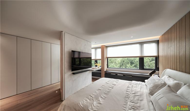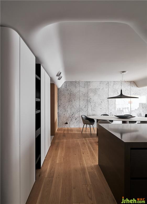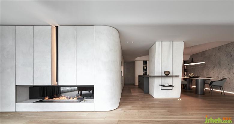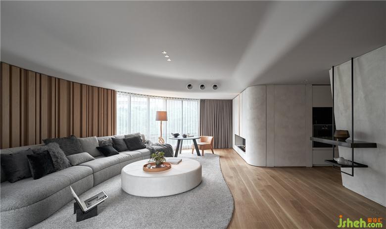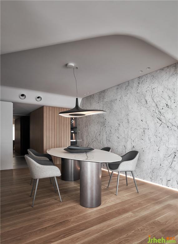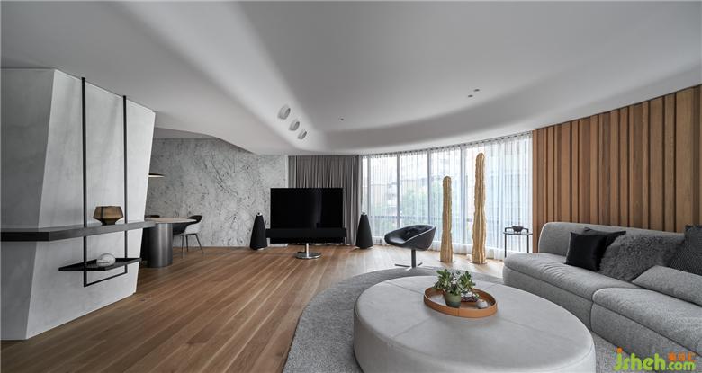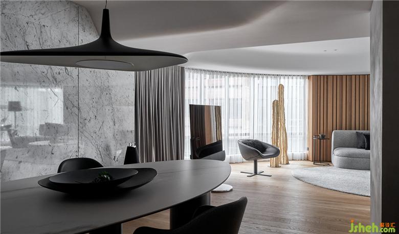 考虑到原始的建筑条件,为空间的调性做了整体的规划,基地坐落于街道的树海区,自然环境围绕着居住者的生活,呼应窗外的景色打造出的休闲氛围,家居装修对于客厅的想象,不以主墙的形式作为空间的区隔,将落地电视安排于沙发和餐厨区之间,生活随性,依照需求产生场域的聚集。材料上使用大量木皮格栅,透过木质温润的特性平衡空间中的温度,搭配白色石材作为餐厅主墙面,利用不同材质更新了场域中主色调的变化,视觉感受的变化,影响了内心,形成了空间中场所的转换。