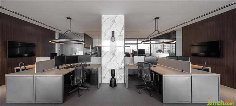 在个人场域中使用水泥色为基底,透过木质元素平衡空间中的温度,使空间充满温润而包覆的私密感。工作场域中以深色木纹降低墙体的存在感,台湾室内设计师以天花的吊灯配置划分出不同组别的空间坐标,同时也让视觉焦点能专注于各自的工作桌面。社交场域中在天花、墙面使用不锈钢及镜面等不同纹理的反射材质,引入室外的自然光线,同时辅以人造光源,让光线以各种波长漫射在空间之中。
