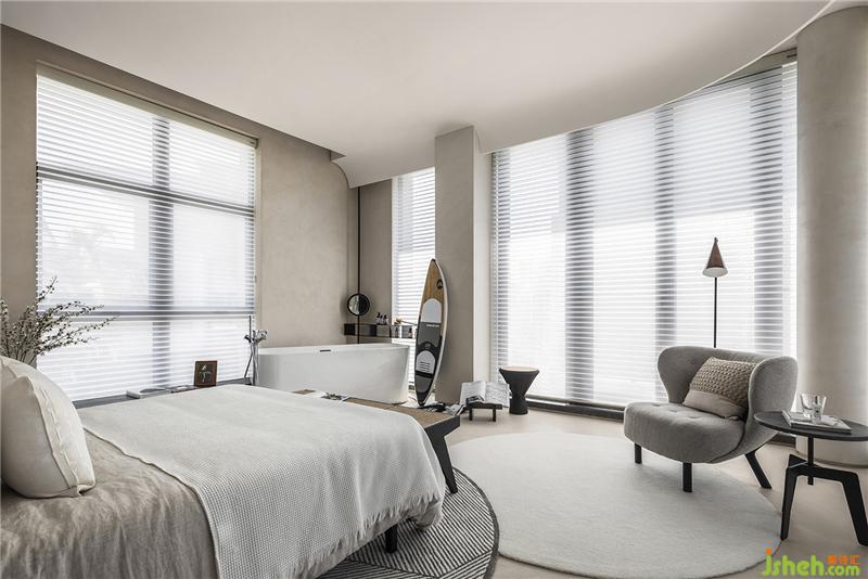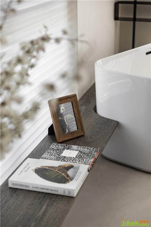 谁说泡澡只能在卫浴中享受,把浴缸独立置放于房间里,旁边摆放着方才去海边的潜具,以泡澡来结束一整个下午的运动时光。睡前坐在床头阅读早晨的尚未读完的小说,转身放置于床背墙中篓空层架,熄灯休息。