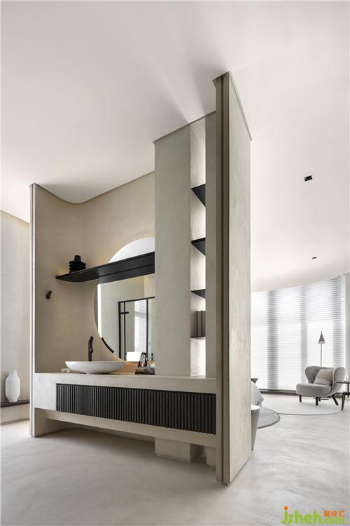 房间的壁面及天花板以弧形收尾,带点女孩的俏皮风格,卫浴面台更是以包覆感受的弧线壁面,让镜面与层架交集结合,线与面的优美展现便显现于眼前。