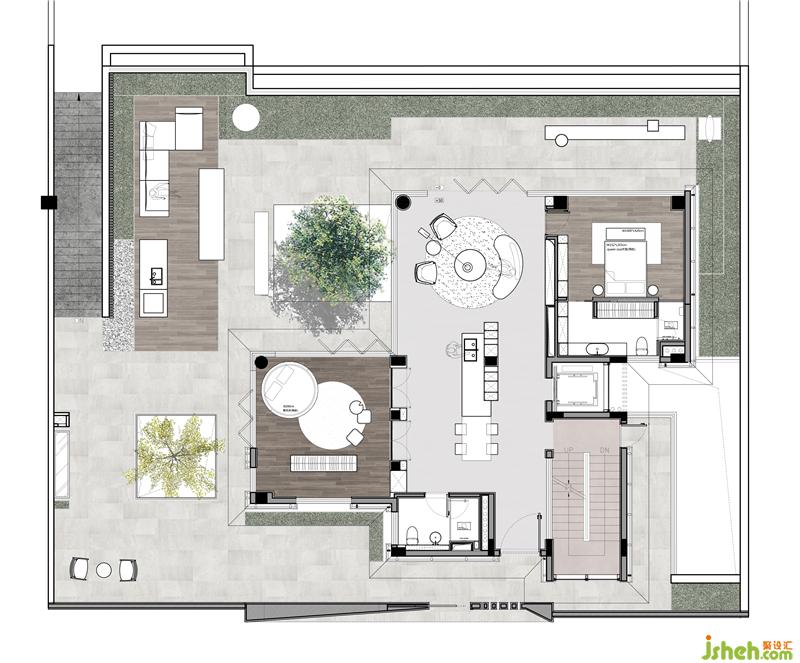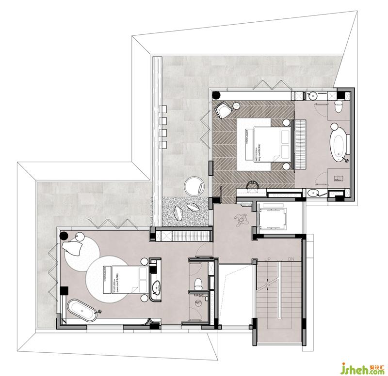 大气的印度黑石材的地面材质台面上展示异形艺术品,相互造成的有趣对话,三亚样板房设计点缀着全家人愉悦的相处空间。此艺术品兼具座椅休憩功能,在空间使用上带出精致生活感,大露台如同一个展示艺术品的美术馆。
