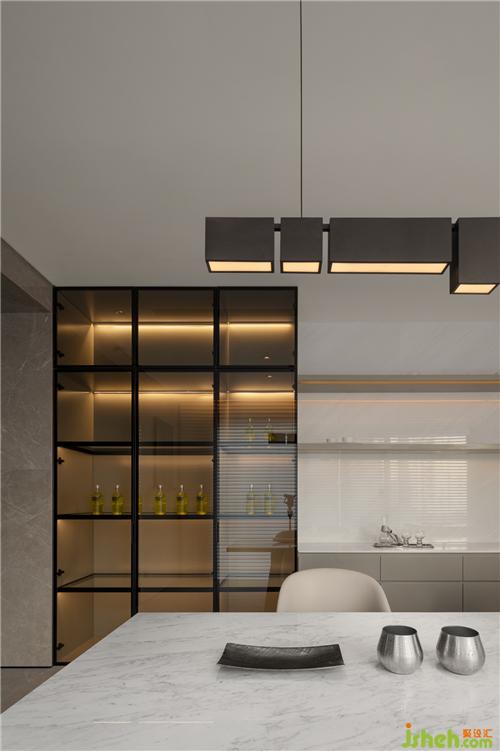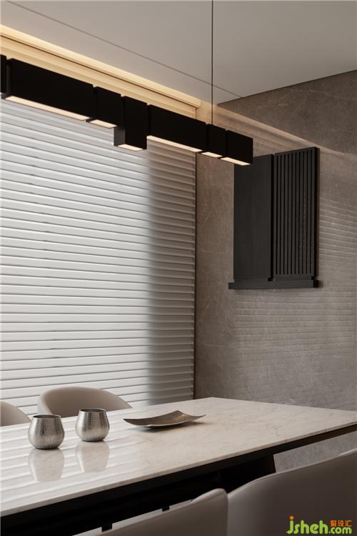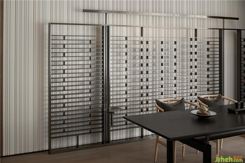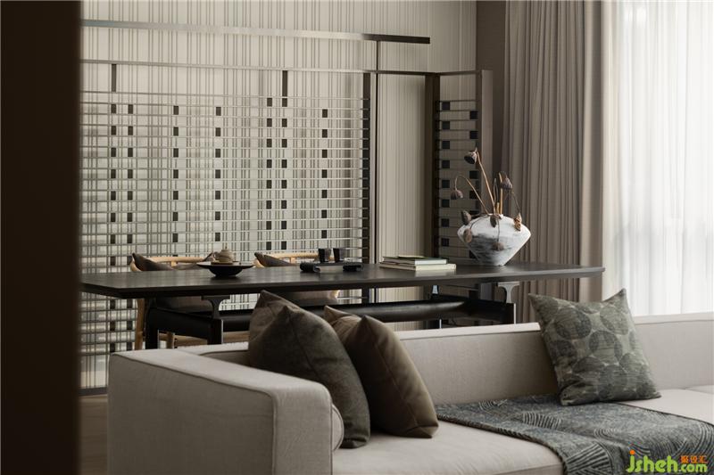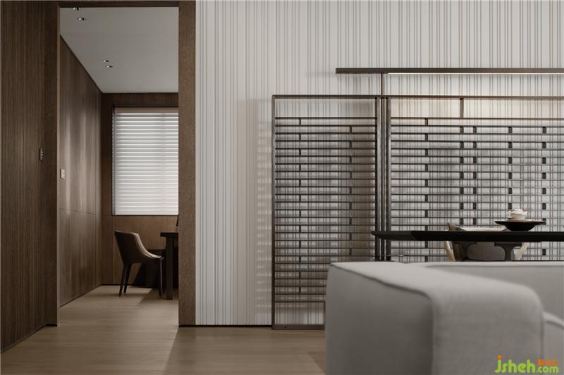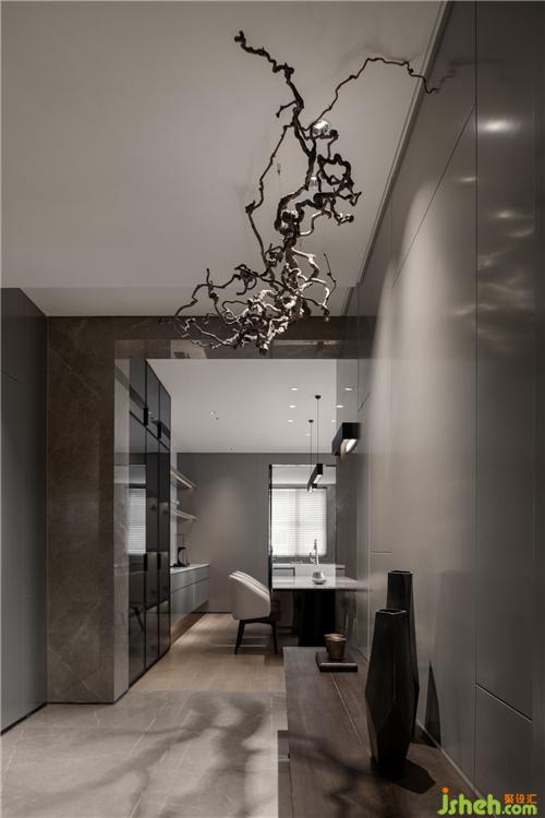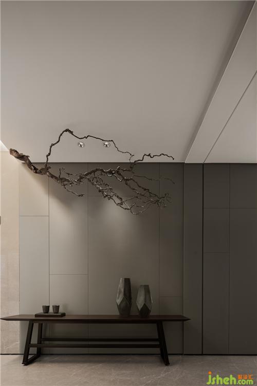 以松柏枝作为暗示、提醒,在入户玄关的短暂停留与接收,达到转换场景的效果,海口样板房设计配合墙体分割与延伸,细节变化中区分不同的动线,平面配置上以玄关起始的动线左右区分主客感。