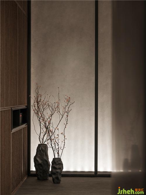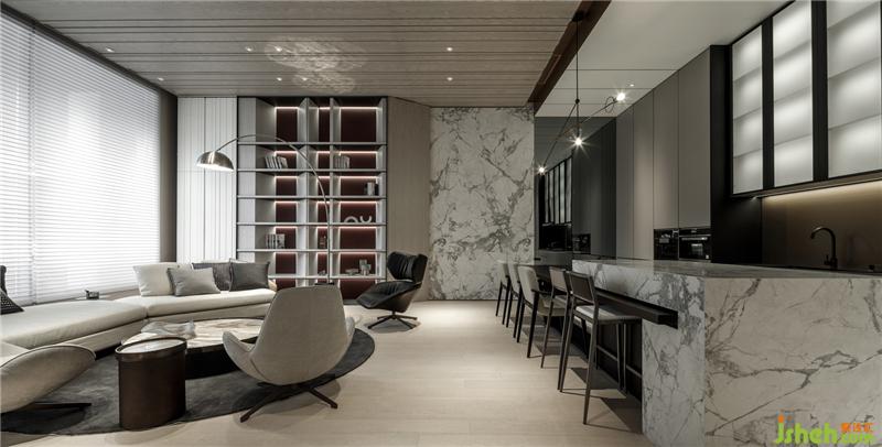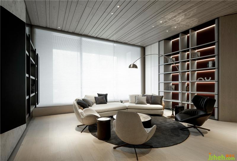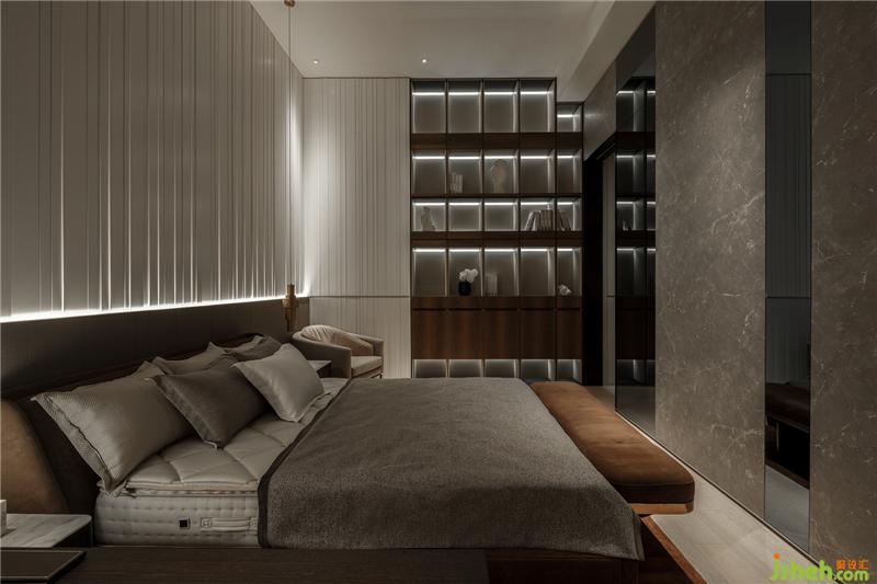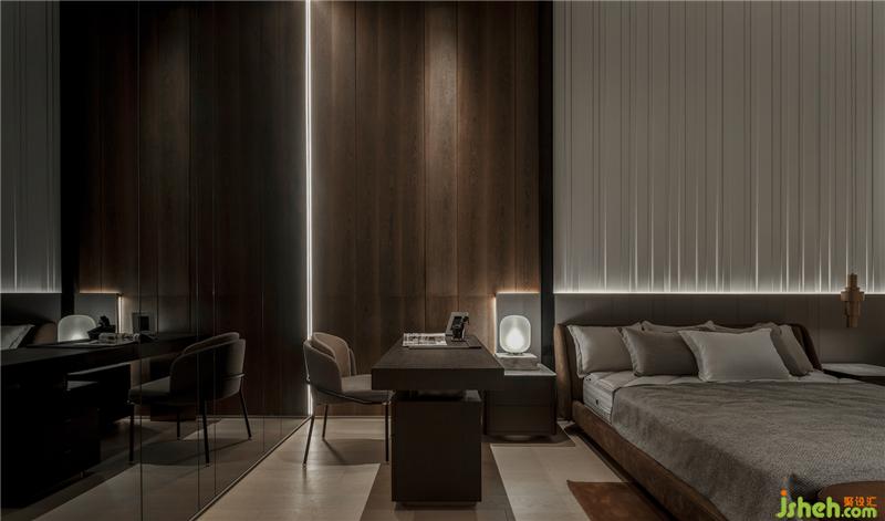 更衣间弧型交错的造型天花板延续整体空间的造型元素,开放的柜体让狭长走到得以释放空间,铁件吊件的造型,展现柜体的轻盈感,减少更衣间的压迫,皮革的背板增加柜体的质感。卧室白色烤漆墙面,墙面线条的分割增加空间的表情,床头深色皮革背板搭配一旁木皮的温润,像个女孩般,有非凡的气质,高冷的仪态,优雅的姿势,炙热的内心