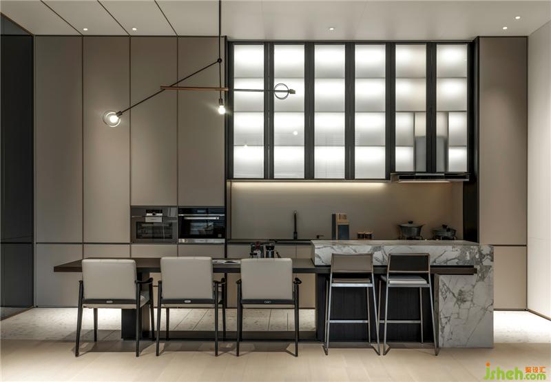 进到展厅第一个空间,赭红色的皮革强化整体视觉焦点,白色石材与浅色木皮衬托出空间的优雅气质,也让空间更凸显的红润,香槟金属的面材,隐约带出空间的低调奢华,圆弧沙发带出空间的恣意盎然,沙发后方柜体斜板造型,创造出柜体的律动感,也增加空间中不同面向的造型语汇。