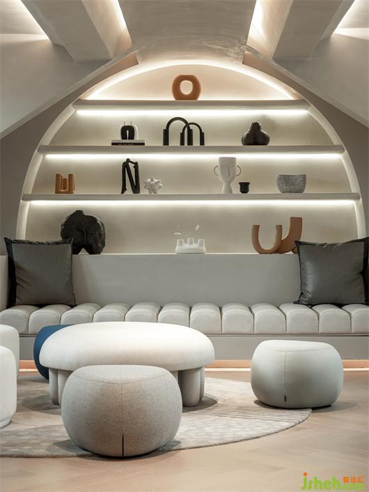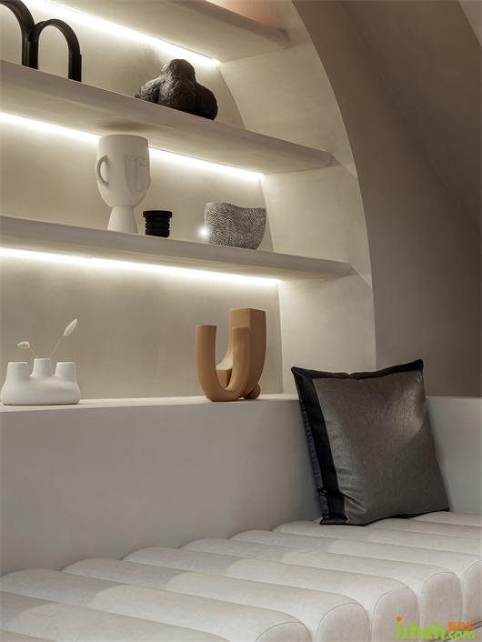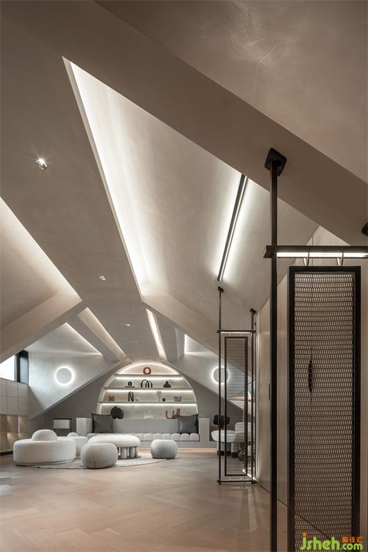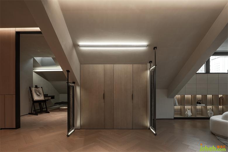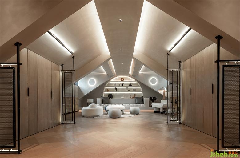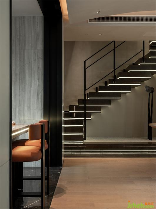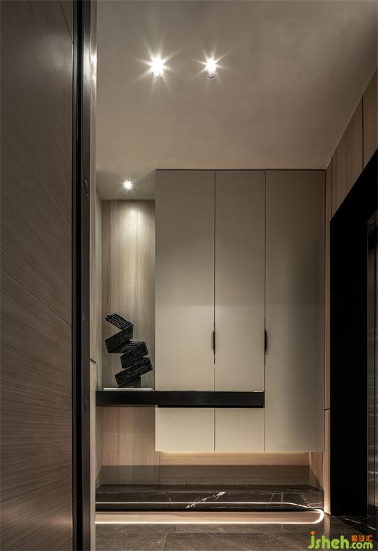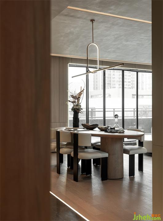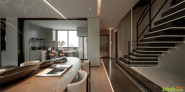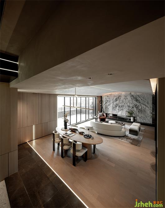 本案以温润的木皮纹理与柔软的墙布做为基底,奢石与不锈钢的结构作为空间的互动对比关系。样板间设计将空间做中垂直水平的分割,使其量体彰显轻奢感,延续其型态转折至不同空间。