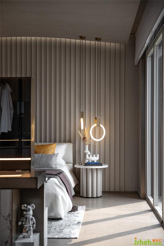 洁净的天花与米灰色墙面、极具腔调的灰色皮革背景、舒适温暖的布艺床品,在简约的空间中相得益彰,构建了一个远离都市喧嚣的诗意空间。