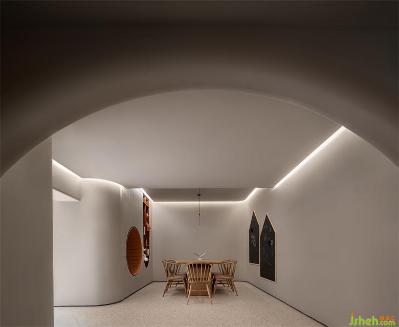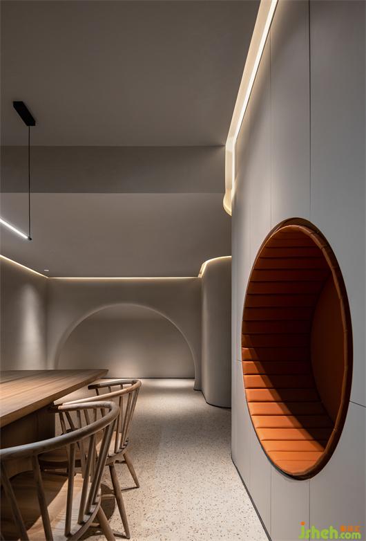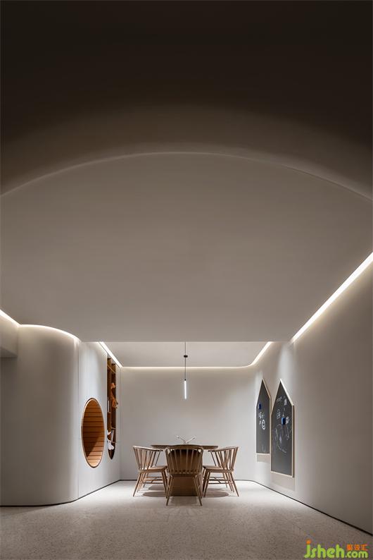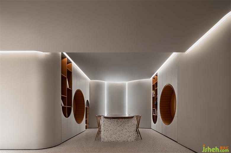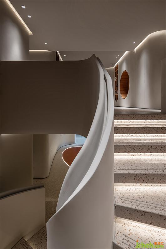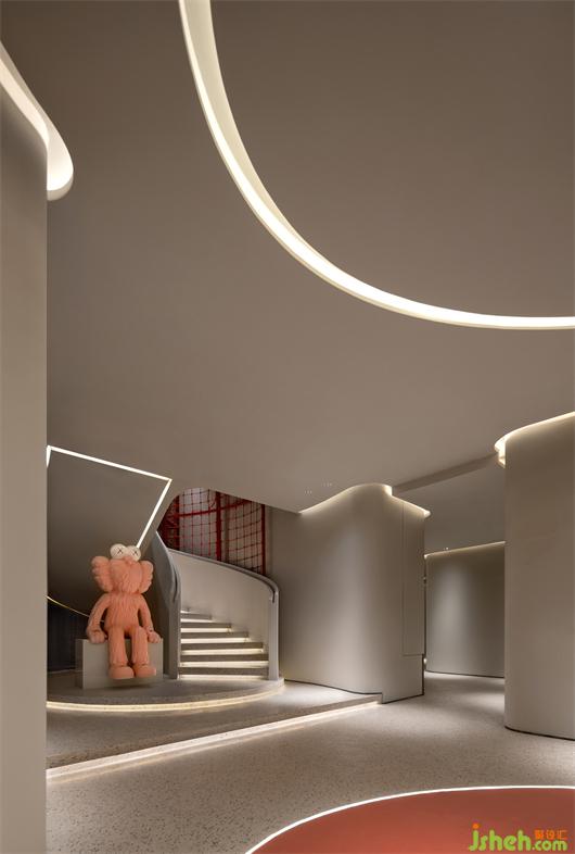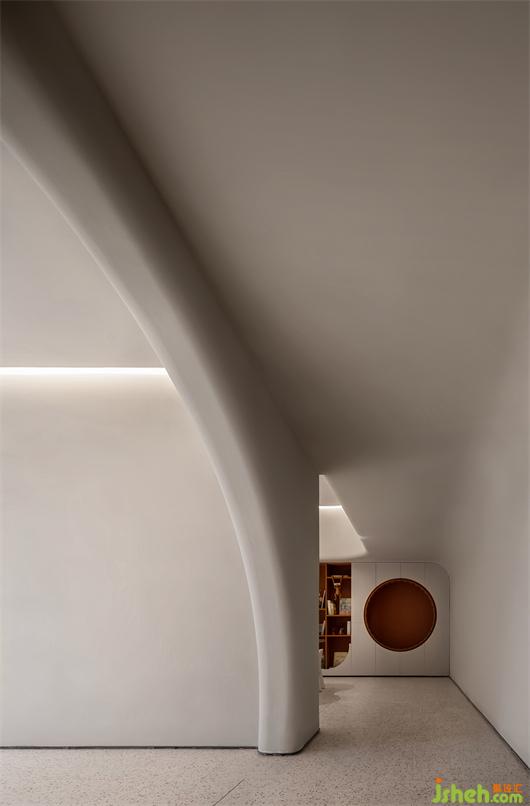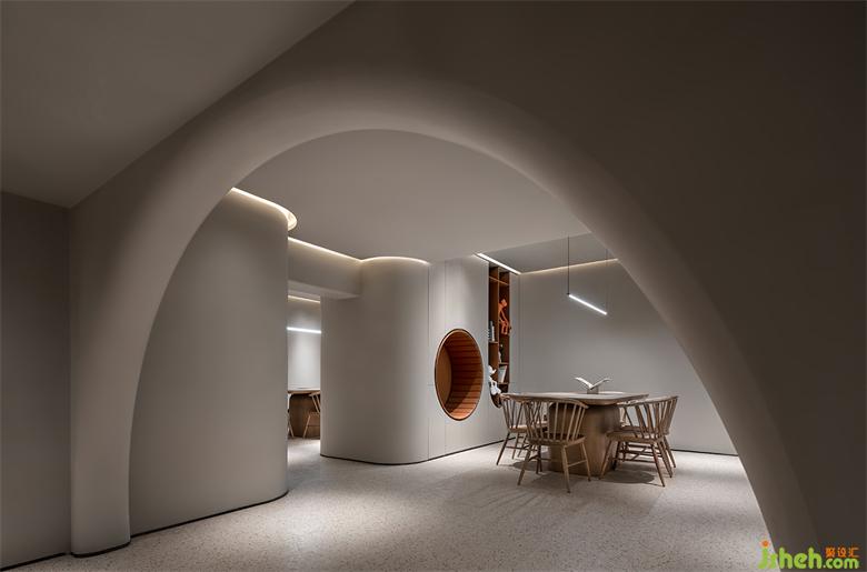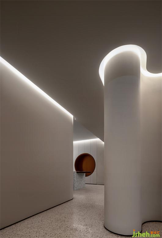 室内设计贯穿了与弧线的线条,与体块分明的建筑感,结合局部开槽、叠加、牵引的手法处理,让建筑体态在空间中自然的伸展。武汉会所设计在整体的空间基调上,漫反射的光照跟随着弧面的线条进行延展,透过精心布局功能及室外景观空间结合,模糊室内与室外边界,以其纯洁、通透、流动的观感平衡两种空间气质,鼓励互动交流,营造出具有现代极简和归家氛围感。