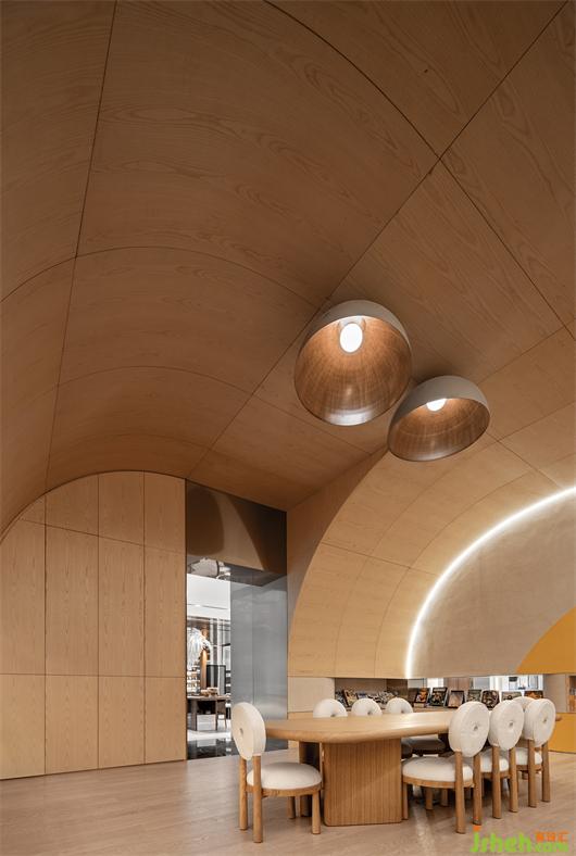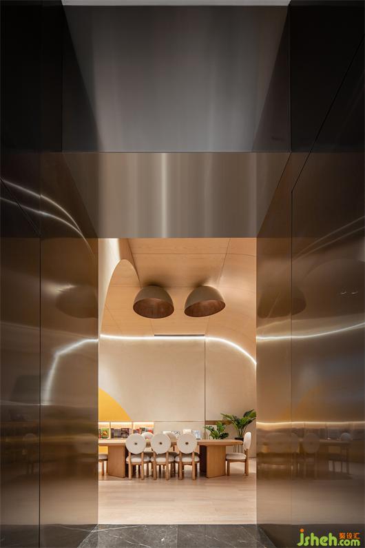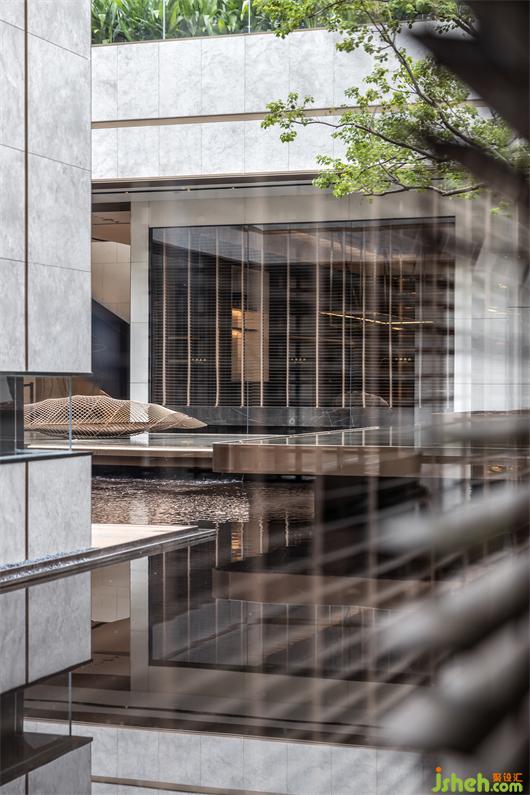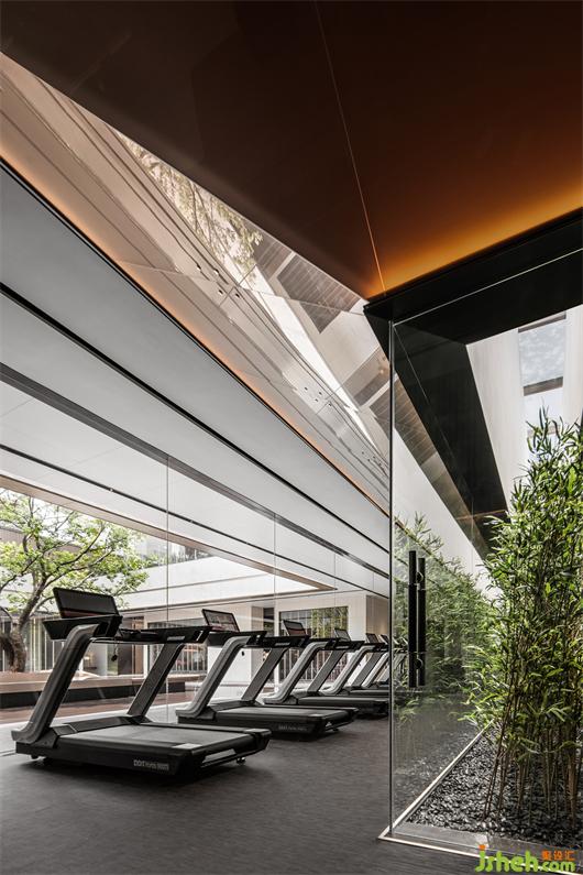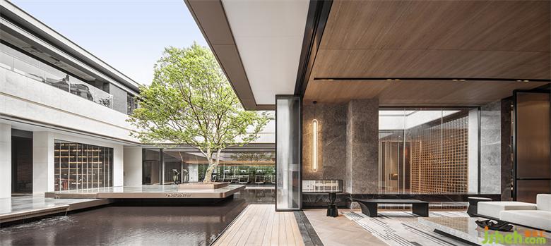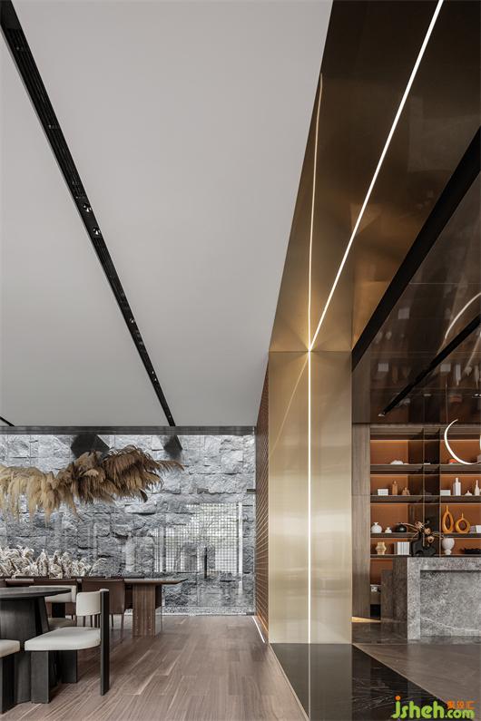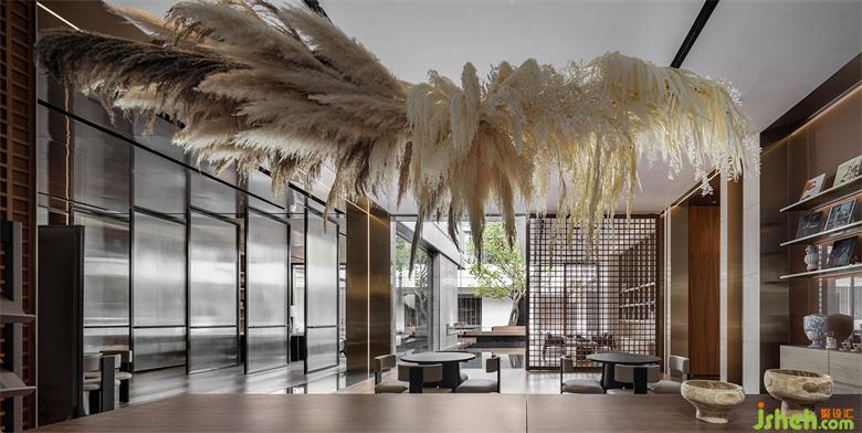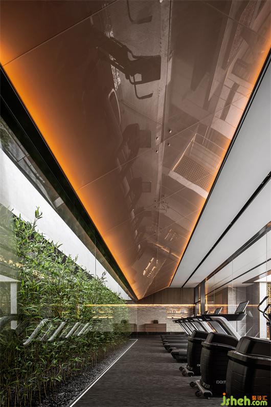 会所设计材料选择上取自增城挂绿的意象,翠绿树海中的一抹赭红,我们试图以木、铜、赭色皮革等材料,带出温润而雅致的空间质感。