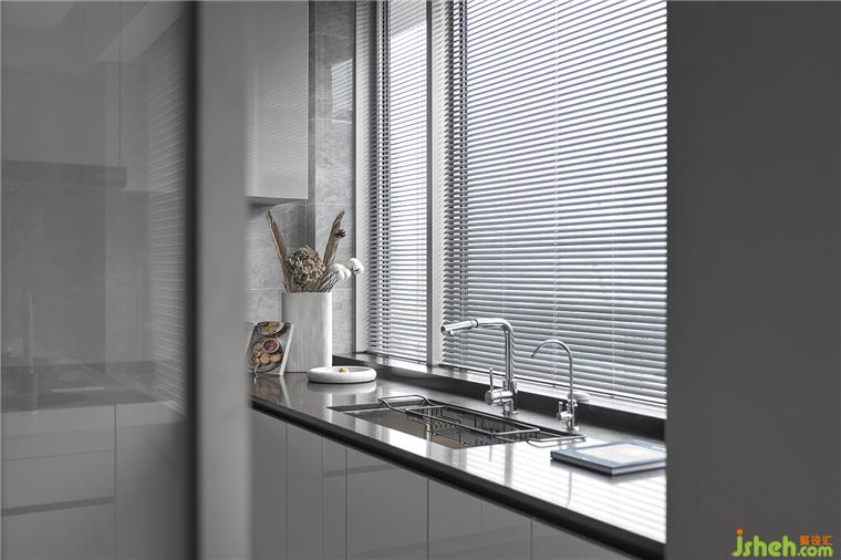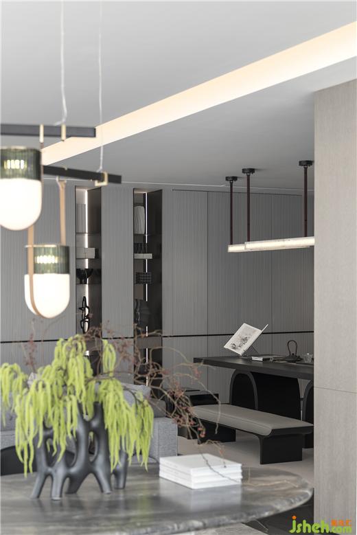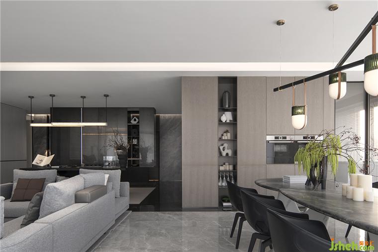 公共区域客餐厅以开放式的设计,增加了空间感的同时,也能满足机能的需求,豪宅装修设计以系统化的方式安排动线,同时增添人与人之间的交流感,达到心理和生理的满足。全景落地窗配置,更是最大化地让每个角落都洒满阳光,阅瞰世界风景,为空间增添了更多生活的想象。以黑白为基调,墙面以灰色、木色进行补充,材质丰富有序,冷色调和暖色调互相融合,关照到生活的每一个细微之处。