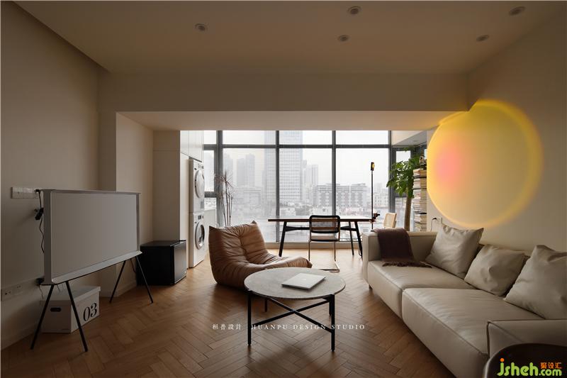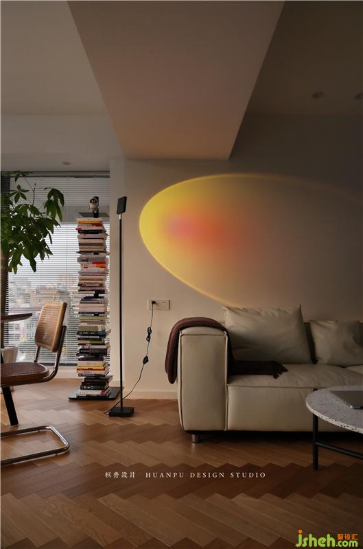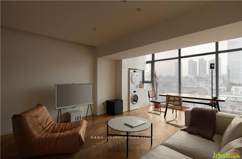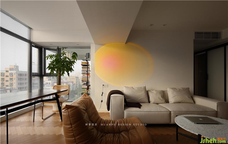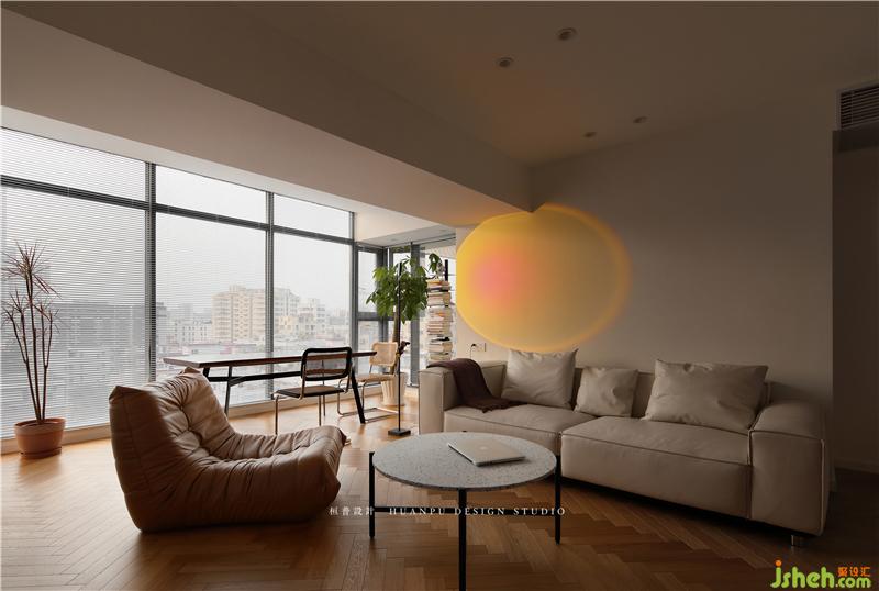 客厅部分四面白墙,搭配人字拼木地板,色调干净温暖。整面的落地玻璃让视觉上更加的开阔,搭配原始的百叶帘,无论是日光还是晚霞,映照进室内的光影都是绝美的。