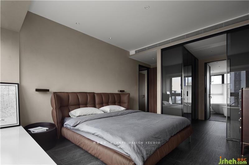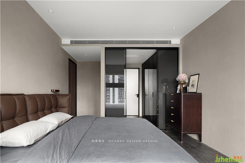 床头背景设置极简的壁灯,增添了氛围感。步入式衣帽间,用玻璃移门作为卧室与衣帽间之间的分隔,玻璃材质的通透性,虽隔断空间却不会显得拥挤压抑。