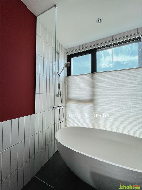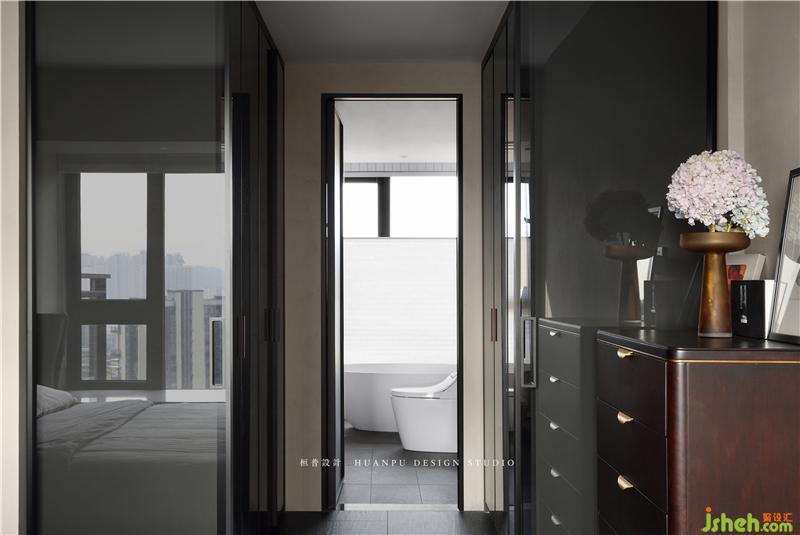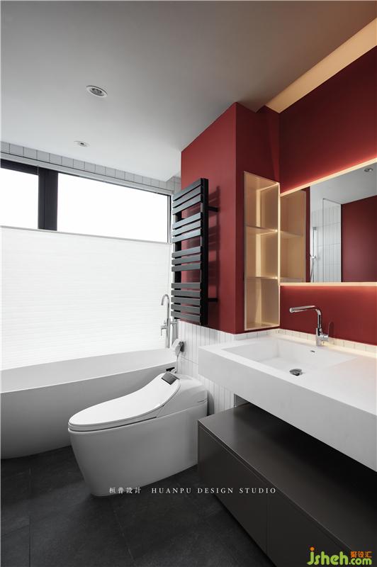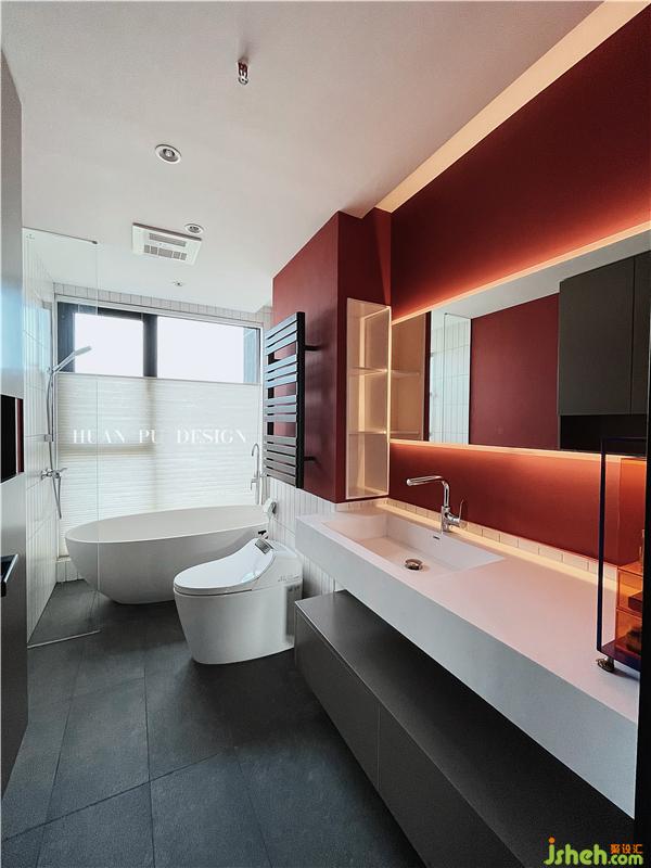 主卫是整个设计里的彩蛋,与整体色调完全不同,抢眼的故宫红在整个空间里跳脱了黑白灰的沉稳,更像女业主活泼又热情的性格。