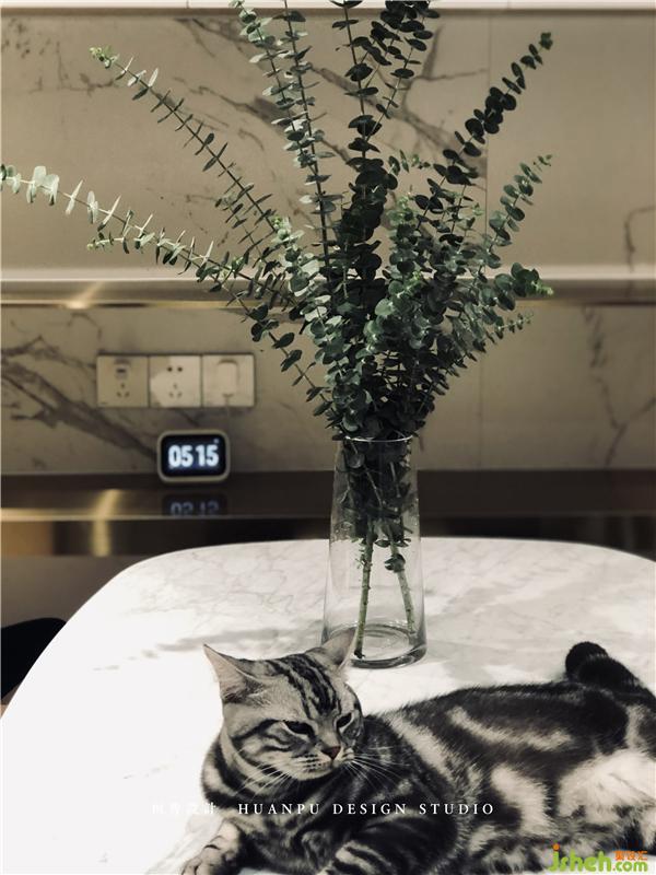 沙发与客厅办公区中间预留了猫咪私人物品的空间,让家里的每位成员都有属于自己那片小星光。