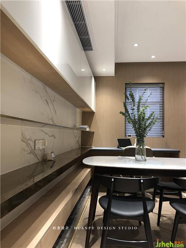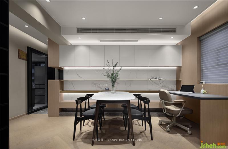 利用立面空间进行收纳,有限空间里创造最大收纳功能同时,放大视觉效果。延伸出来的办公桌则是充分利用了多余的空间。在合理利用空间功能分区的同时也兼并了视觉上的美观。