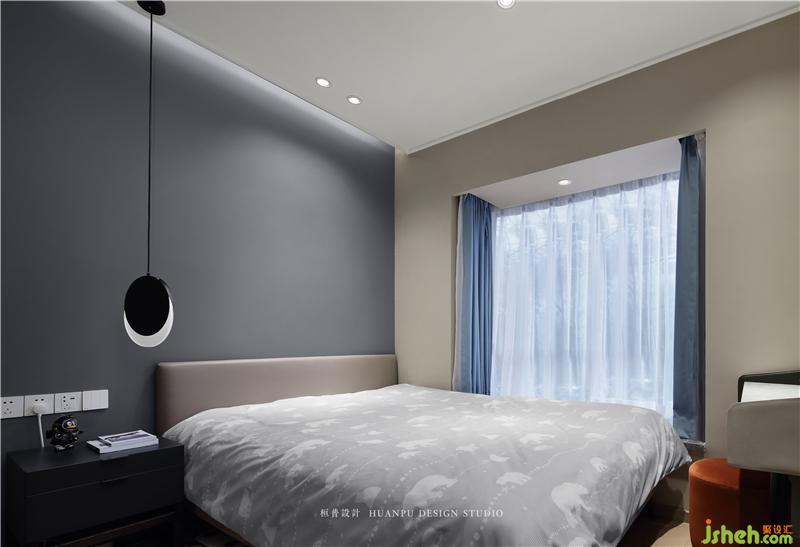 墙面是蓝灰色和牙白色,给人一种稳重又安心的感觉。而吊挂式的月牙灯,点缀了每个夜晚的星空。丰富的材质,低调的质感,优雅的基调,构建卧室不一样的美好。