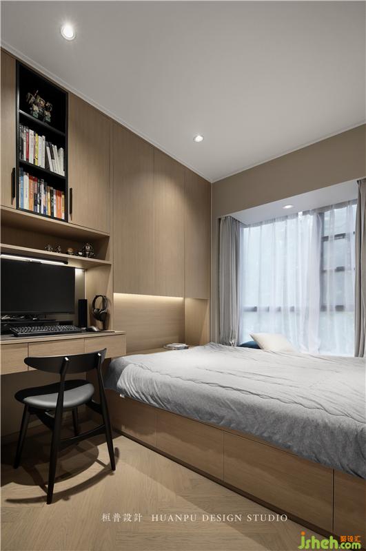 次卧同时兼备书房和客房的作用,墙面是整片的储物柜,整体色调同样偏低饱和,无论是平时工作还是客人入睡,都会相当舒适。