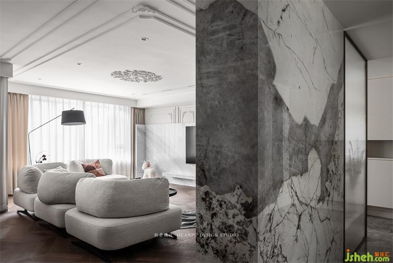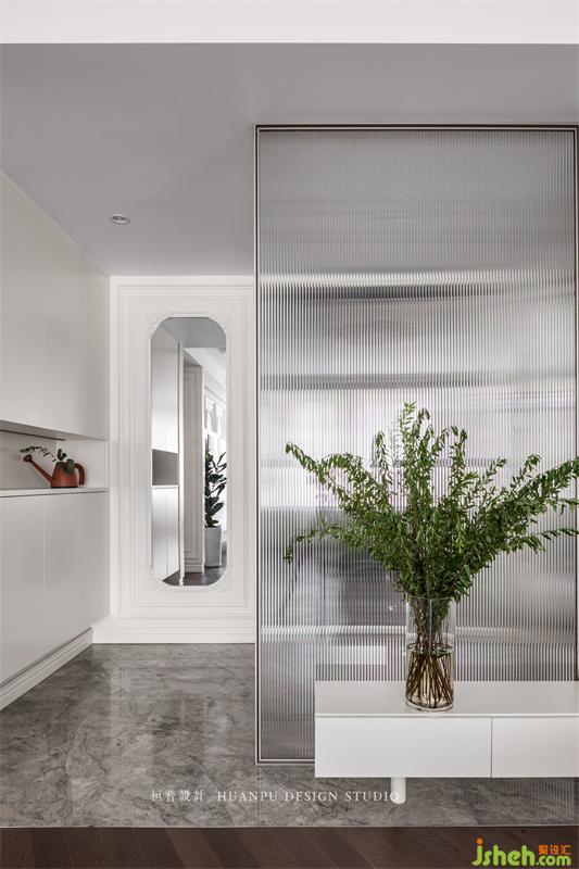 由于业主热衷于不同的材质拼接,所以玄关处的地板选用的是大理石,而客厅选用的是木地板。其之间还用了屏风和连纹岩板进行隔断,分割成了两个独立的空间。在挑选屏风时选择了长虹玻璃,可以优化玄关的采光,增加了室内的朦胧美感。同时增加了空间的通透感,但也保留了一丝神秘感。