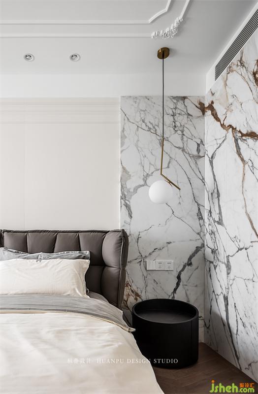 主卧的设计感会相对强一些,护墙板跟岩板进行拼接,给整个空间增添几分艺术感。球形床头吊灯营造了一种浪漫氛围,而墙体上的条状壁灯与吊灯有一种平行呼应的感觉,使得整体在视觉上更加舒适。