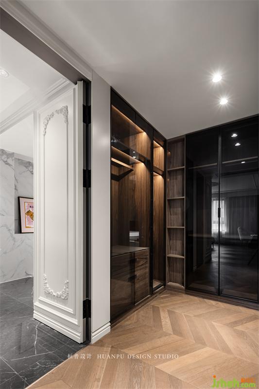 主卫的门采用了隐形门设计,关上之后保持了衣帽间的整体美观度。玻璃衣柜门与木纹衣柜相得益彰,起到了展示与收纳的作用。