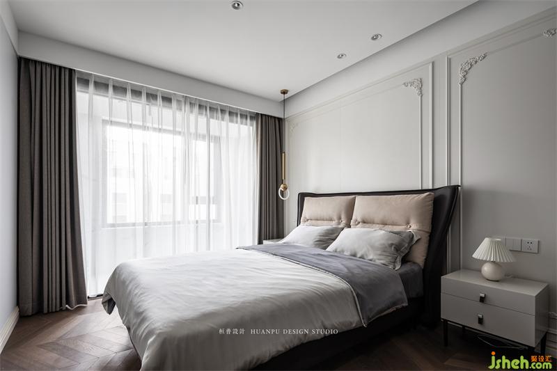 由于父母只是偶尔过来居住,所以选择在父母房旁的增设空间作为阳台使用。父母房没有额外在墙体上做材质碰撞,跟全屋整体一样使用护墙板。虽然是白墙,但法式线条雕花让整个空间看起来更加简约大方。白色床头柜与小台灯很好的与房间整体风格融合,沉稳简约。