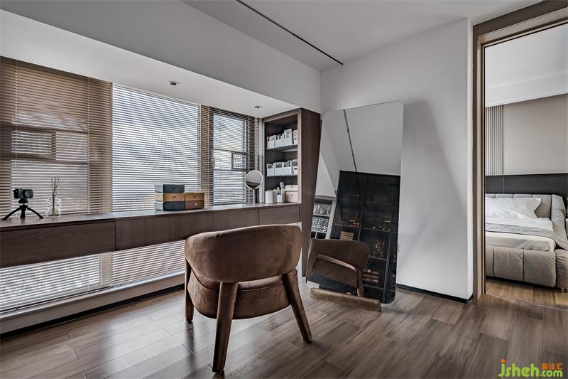 本次案例亮点莫过于是主卧的超级衣帽间,进门右侧是一张长条化妆桌。看起来平平无奇,其实这张桌是一种翻盖式梳妆台。打开之后有一面带灯的镜子,而桌子内部就是可以放置日常会使用到的化妆工具和化妆品。