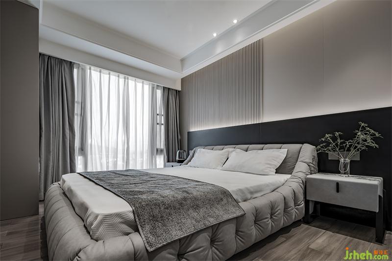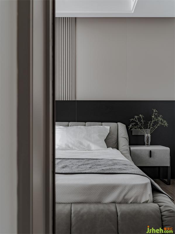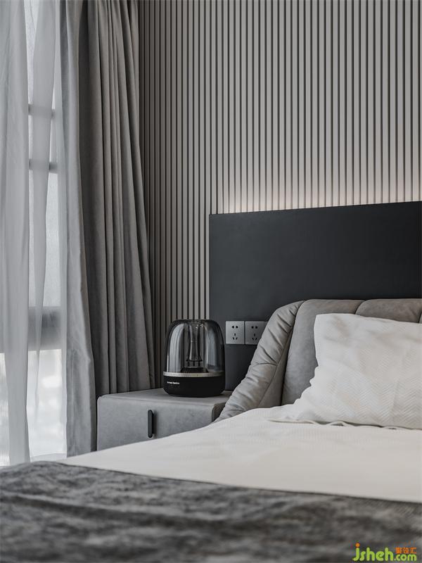 主卧床头做了一个格栅板与黑色岩板的拼接,设计感满满。暗藏灯带给卧室带来氛围感,增添舒适度。床对面还做了一个可伸缩投影幕布,在床上看电影真的太舒服了。