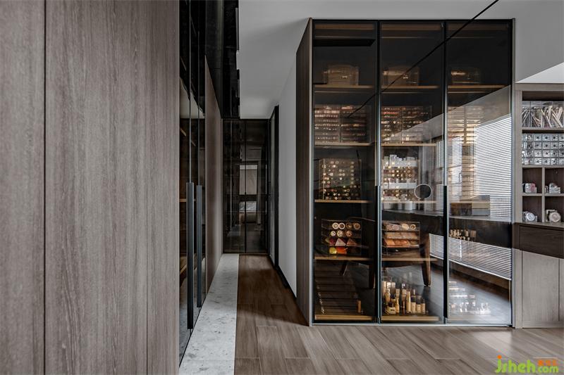 书房对着的就是一个小型水吧,业主特别喜欢这个像音箱的小冰箱。它作为一个冰箱,除了可以冷藏,还能起到一个装饰的作用。可以看到有大面展示柜,主要是放置红酒香槟等。工作学习之余,还能在这小酌一杯,真是浪漫人生的惬意瞬间。