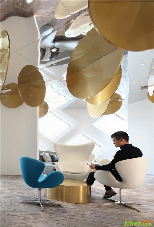 The inner place follows the spatial logic of the reception area and continues to use stainless steel mirrored ceilings. The image of "circle" is still the measurement scale of space. The semicircle art installation embedded in the stainless steel ceiling is transformed into a whole circle of different sizes and directions through the projection, creating a light floating feeling.