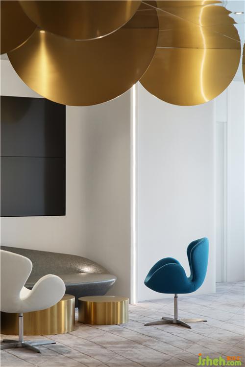 Metal textured round tea table, abstract cutting art painting and Zaha's famous moon sofa become flowing bonds, blurring the boundary between interior and architecture, and constructing a compound functional space where practical experience and aesthetic image could coexist. The concept of “circle” in white and gold creates a comfortable spacial experience in a transparent and soft way, and a quiet blue becomes the presence of a breathless beat.