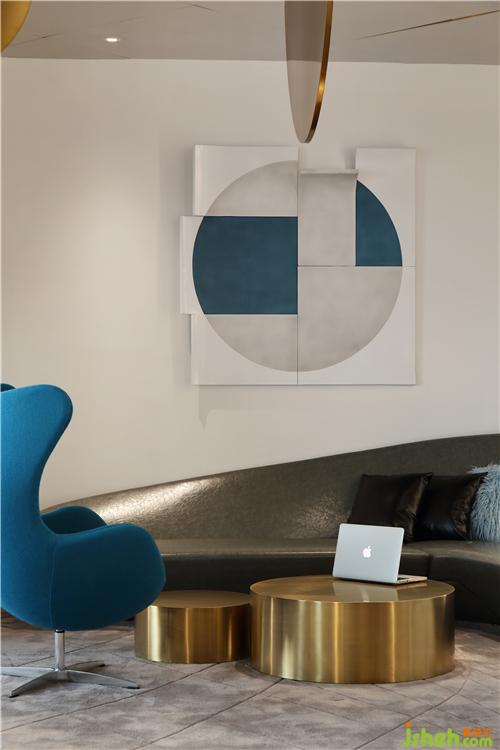 金属质感的圆形茶几,抽象切割的艺术画作,扎哈知名的月亮沙发成为流动的纽带,将室内与建筑的界限模糊开来,建构出实用体验与美学意象共存的复合功能空间。白金色调串联起“圆”的概念,用通透而柔和的方式营造出舒适的场景体验,一抹静谧的蓝成为跳脱呼吸节拍的存在。