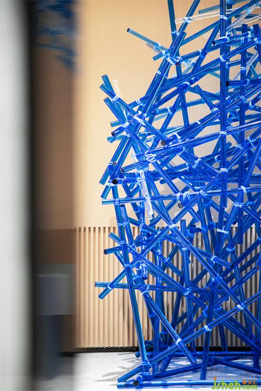 笔挺刚劲的树脂材料进行形式化的重叠,围合组成二分之一圆,销售中心设计在二层空间与“光之印迹”彼此呼应,更为跳跃的蓝色是浮动在空间之海上的泡沫,唤起生机和想象。水、光线、宇宙和往复进入的人共构一条河流,它的无限性将过去、现在和未来联系在一起,而空间便是时间的河床,将一切承载。