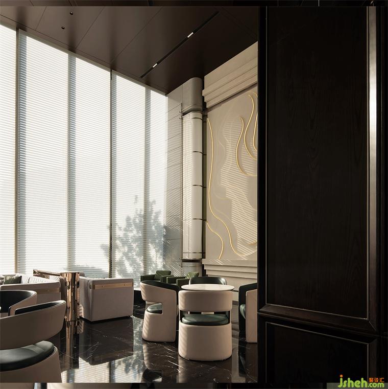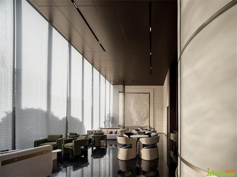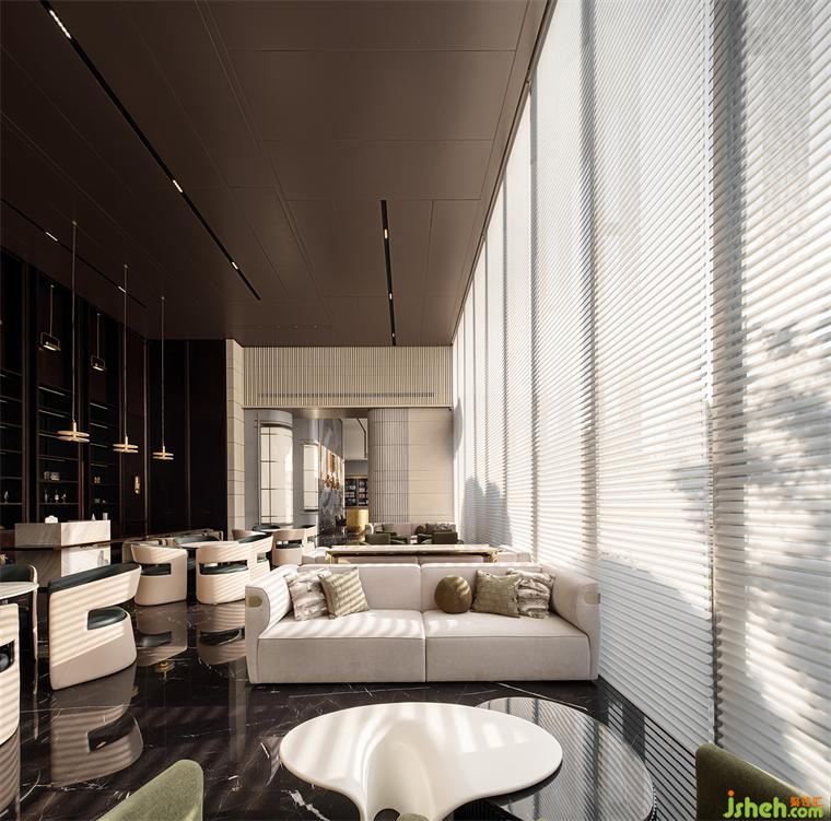 转入开放式综合洽谈区,高挑的屋面与整面条型窗将室外纳入。售楼处设计沉入深棕色的水吧区将一块西方古典主义的拼图嵌入东方当代生活,另一面则是与自然相融,松弛、优雅、璀璨的现代生活,悠长时间线上的两点碰撞出超越时间性的精神体验。