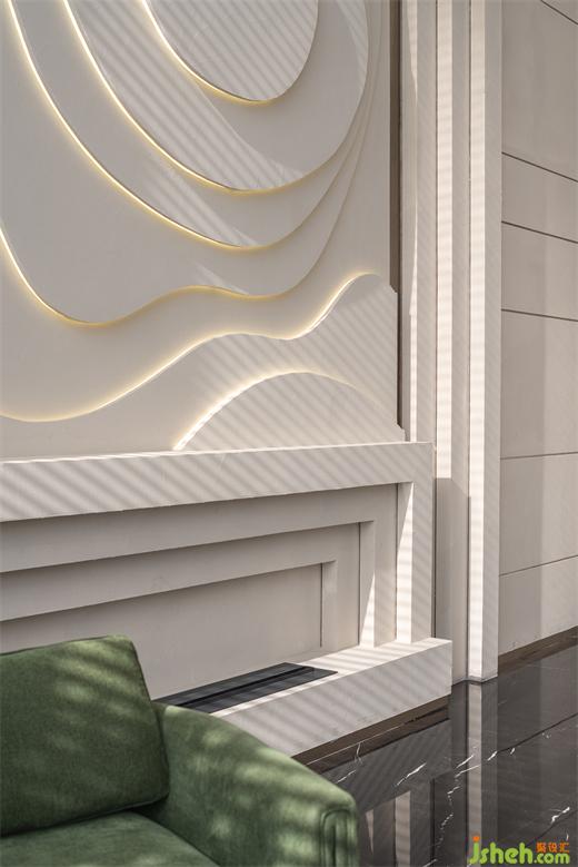 巨幅艺术装置结合灯光营造出城市与土地的抽象概念,柔和的结构线角又因为粗犷的材料肌理而平添无华质朴,售楼处设计细腻的面料与金属的光泽感彼此辉映,色彩则取法自然,与居住空间一体两面——出则繁盛丰盈,入则隐匿自在;千变万化、长住长新,都市生活与精神共栖。