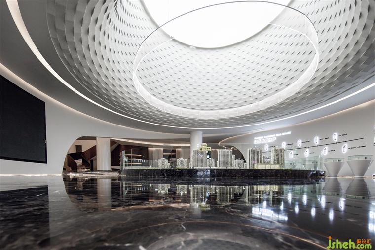 售楼处设计师利用结构柱和两层嵌套的柔软曲面撑起一个巨大的向下垂蔓的核心结构,顶部与立面相连,以此作为整个空间的流线核心和视觉主体。结构柱与穹顶和地面的接触点撑起中央更开放的空间并形成更大的跨距,这是传统拱形结构无法实现的。它像一座只有屋顶和地面的房子,立于坚实的黑色土地之上。