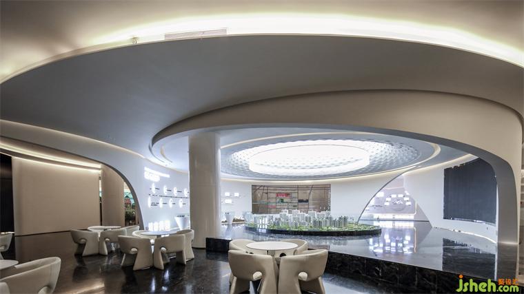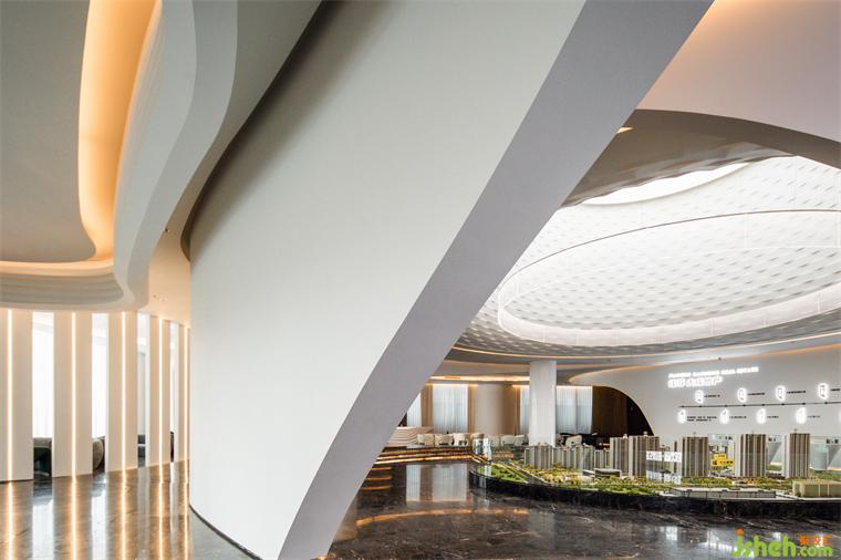 在规则的1200㎡内部,无论是生活家园还是精神图景,售楼处设计都放弃了直角、坚硬与顽固,转而追寻自由的弧与流线,那是在河流、波浪顶端、云的边缘、人的脸庞上的曲线,曲线构成了该项目设计想象中的全部宇宙,一个弯曲的、爱因斯坦式的宇宙。