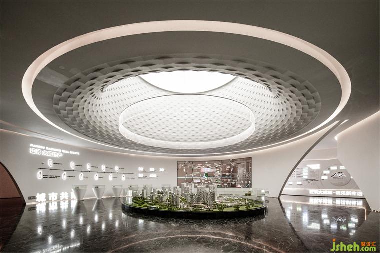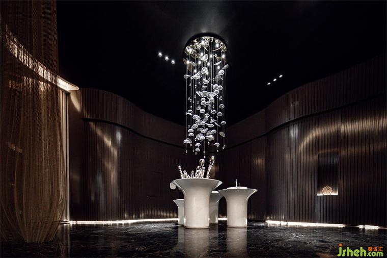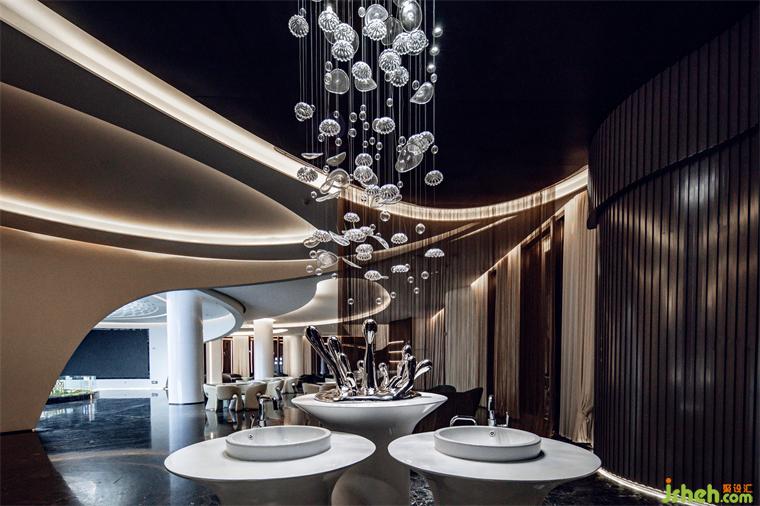 在弘大的空间艺术背景下,装饰性语言几乎全部隐去,只做自然的大写意。售楼处设计盥洗空间打破传统,圆滑立面包覆深色条形板,一组水母装置照明由屋面垂下溅起凝固的水花,身处其中犹入深海。