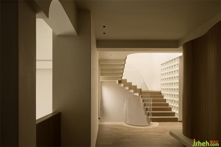 将至顶层倾泻而下的光线洒入移步而来的楼梯间、行走里的从底层到顶层光线视野内外脚步声变化,构成行走的风景。