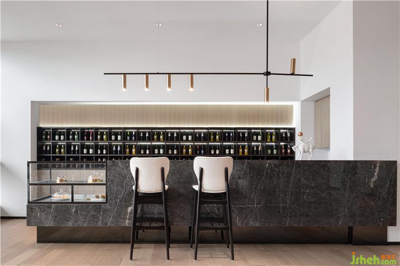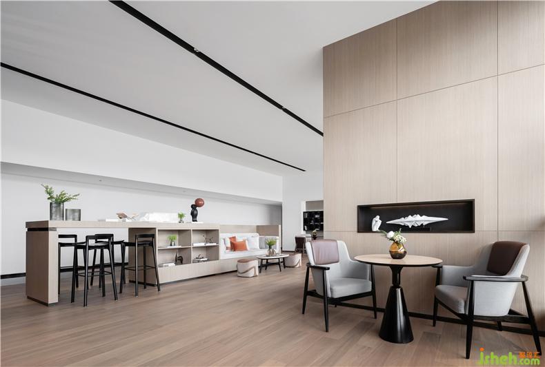 顺着空间的轨迹,设计回归了本真,仅关乎线条。长条形组合内嵌式沙发与展示桌给过道替换出足够的活动空间,既保证了空间的流畅性,又起了隔断作用。