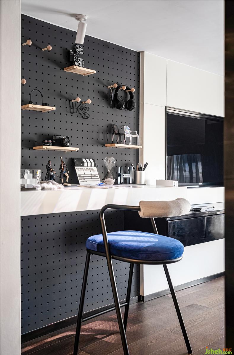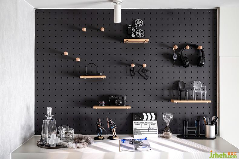 自由、开厂、灵活的工作台布局,可随著时光的流逝和爱好的不同而调整变化。镂空金属面板将模型、收藏品、电子配件置放得尽然有序,工业风在有个性之余也发挥了实用性