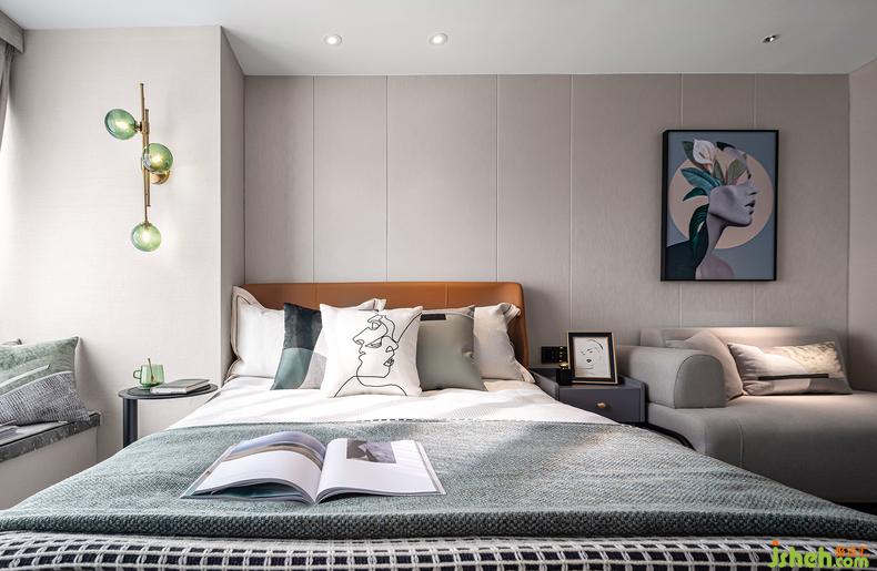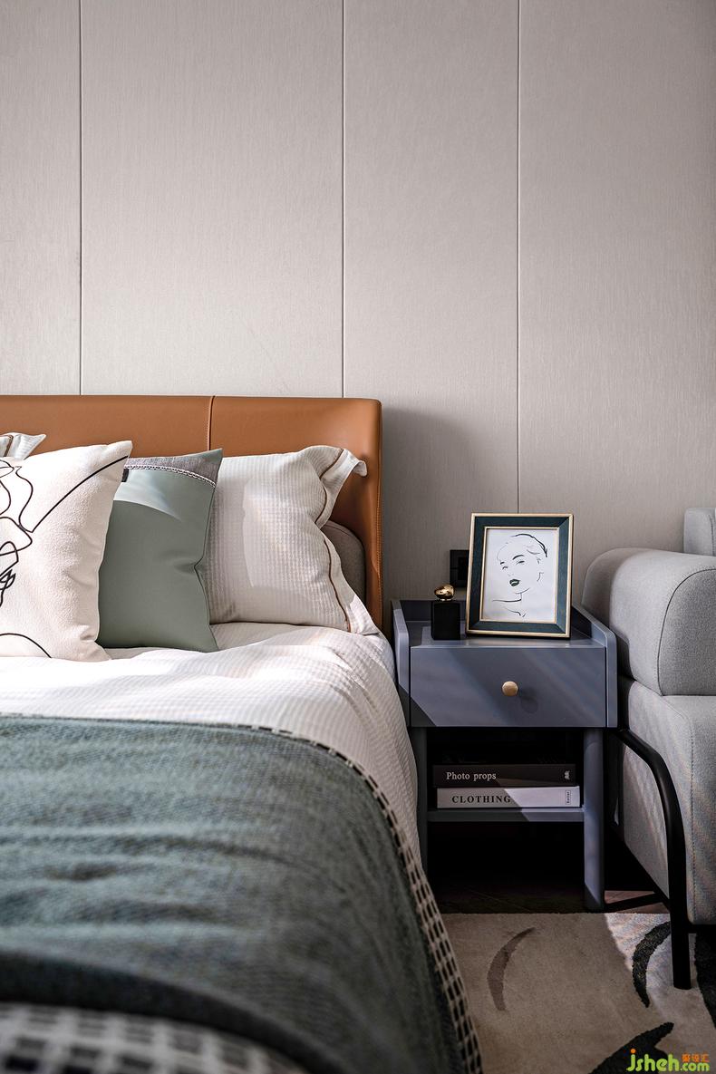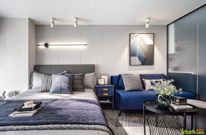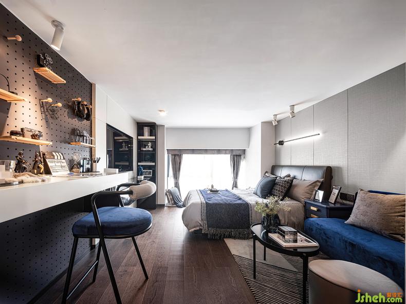 客厅卧室一体化,以纯白为主色,深蓝色穿插其中,不同色阶之间的过渡平稳自如,使得整个空间愈加深沉大方样板房设计