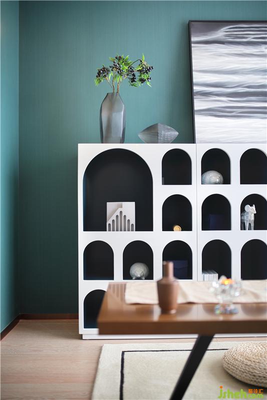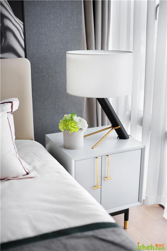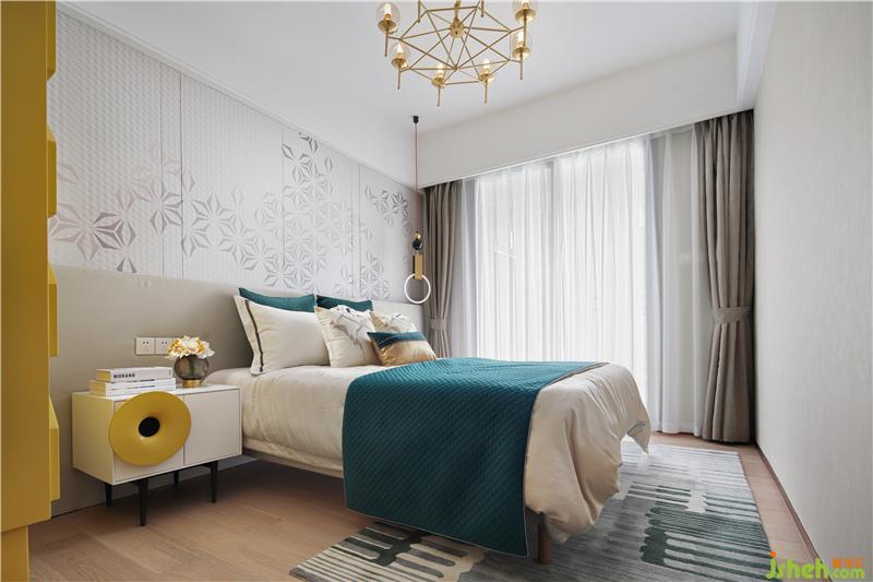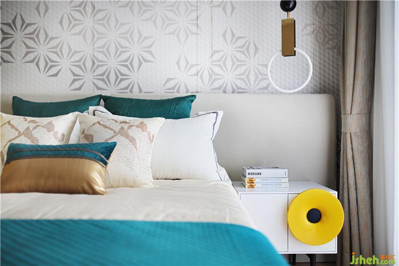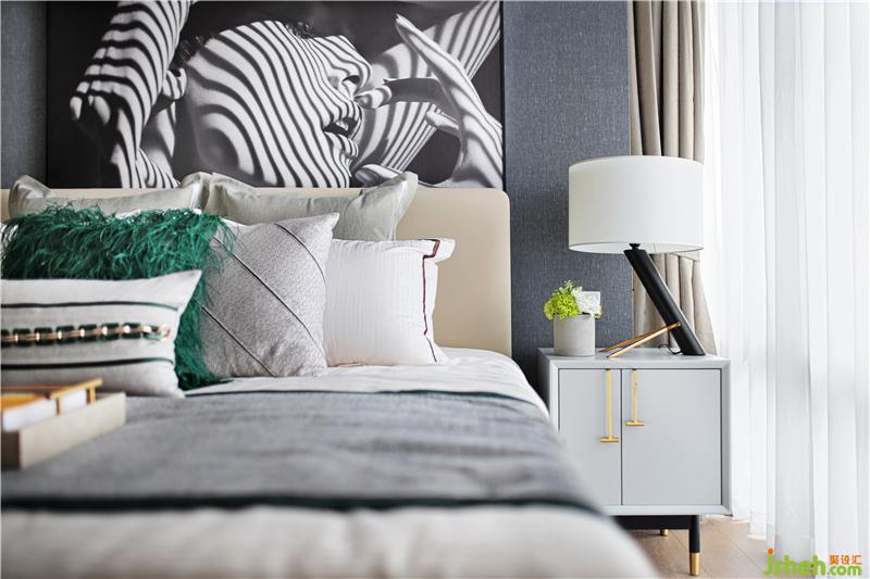 黑白灰的光影,暖暖的窗帘和床呼应,安静温暖的床,是小两口最私密的空间,床头是他们最爱的摄影作品,床上祖母绿流苏抱枕正是女人柔美的象征。样板房设计