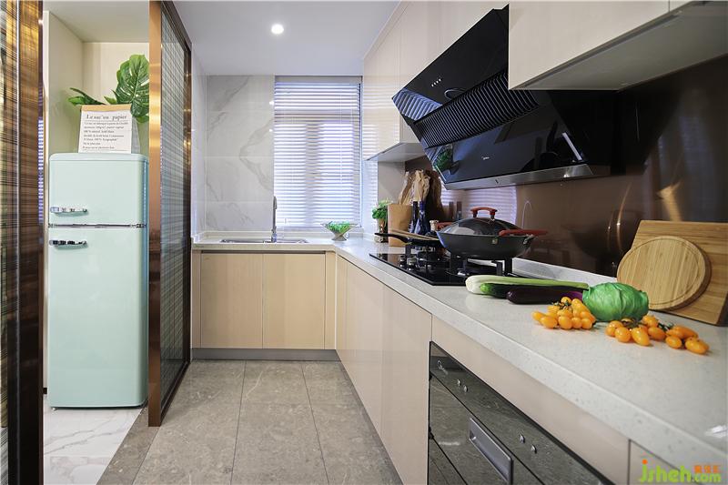 传统的厨房,没有繁琐的造型,地柜吊柜的为储藏物品准备了很好的空间,不锈钢板的墙面让整个空间干净又整洁,为后面的清洁节省了不少的时间。