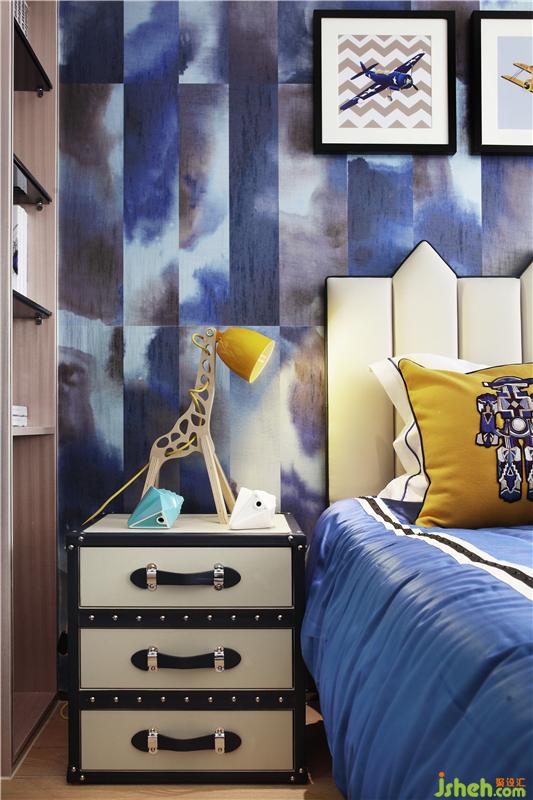 男孩房采用深蓝的色调更突出男生的沉稳和理性,明黄显得轻快,地毯的几何分割活跃了空间的氛围。卧室带有一丝英伦风,融入气质蓝色皮革,酷酷的风格让我们想见小主人的十足个性。但足球,似叛逆,似向往,又凸显了孩子调皮的一面。
