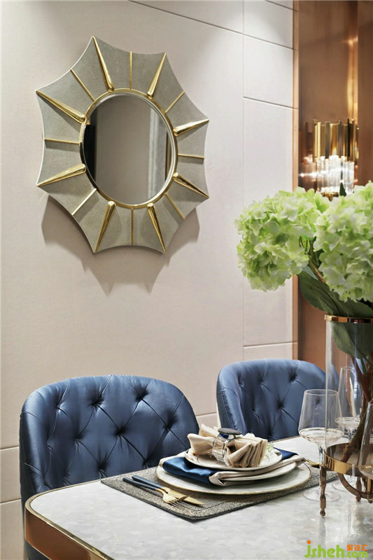极具后现代主义风格的太阳壁镜极具艺术气息,既改善了白墙带给人的单调感受,增添了视觉层次,又让餐厅空间得到了延伸,增添了灵动的视觉感受。