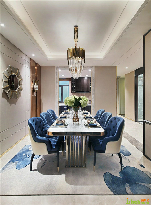 宝石蓝的丝绒座椅色泽低调内敛,造型古典而华美,设计线条柔和精致,弧线形的椅腿与直线型的餐桌支架相呼应,洁白细腻的餐厅桌面映衬淡雅的蓝花地毯,餐厅空间奢华的风格之中又巧妙添加一丝清新,相得益彰。