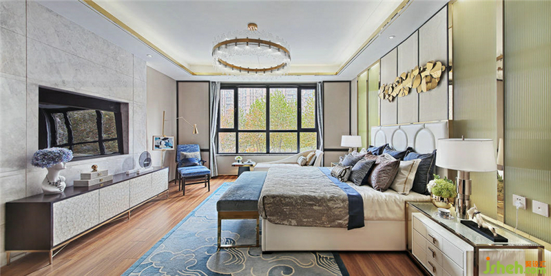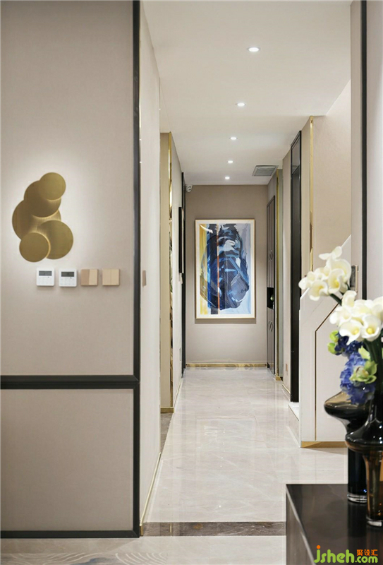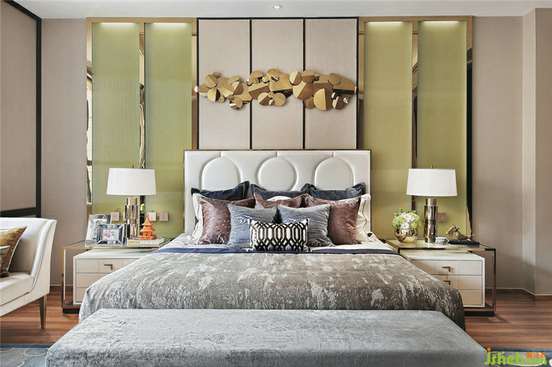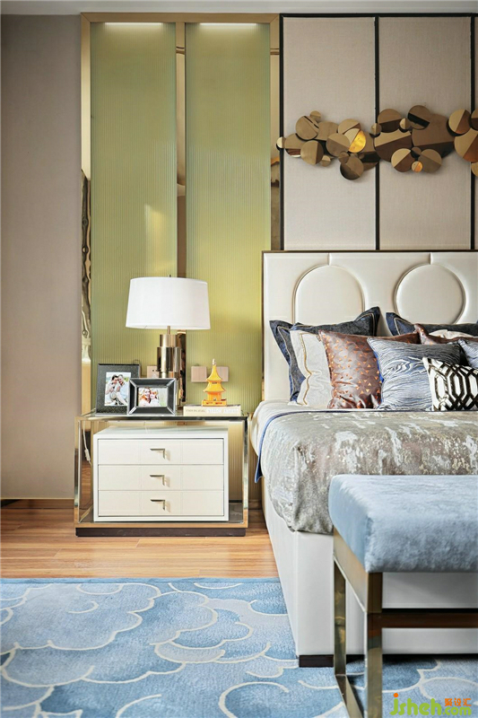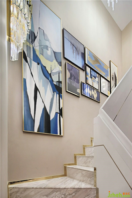 色彩鲜明的壁画组合为奢华的空间之中增添了更多的艺术气息,柔和的质感中和了金属、瓷砖的冷硬,带来更舒适的审美享受。样板房设计