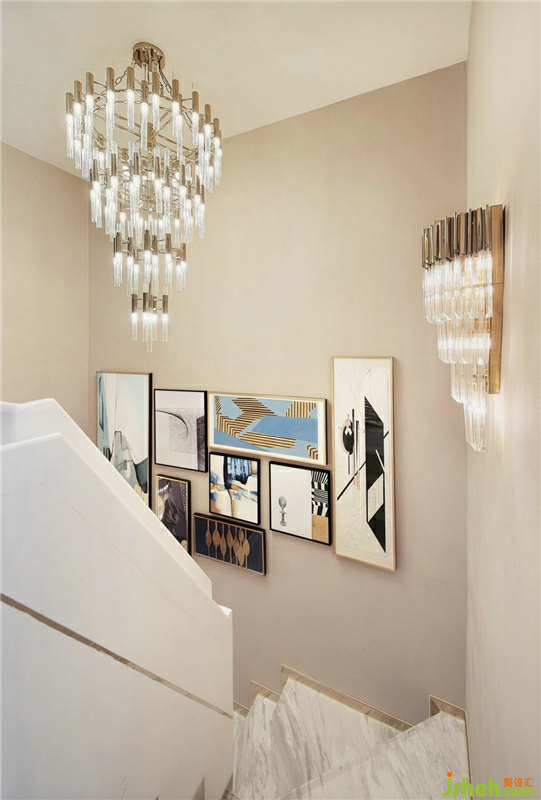 楼梯的照明采用吊灯与壁灯的组合光源,多层次多方位的光线让楼梯的照明没有一丝死角,温和明亮的光线点亮楼道的每一个角落。金属底座与水晶灯饰的搭配更增添了光线的朦胧之态,圣洁而华美。