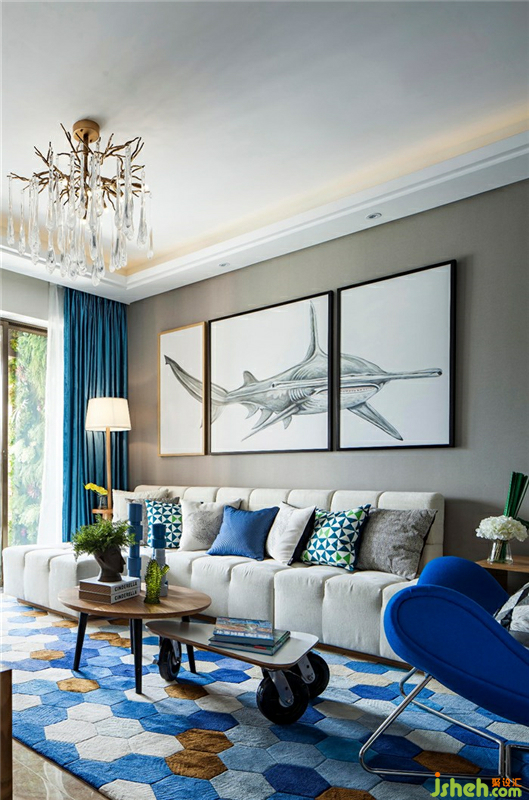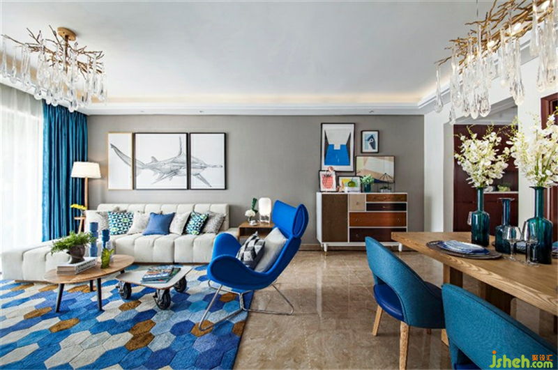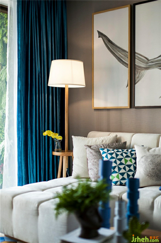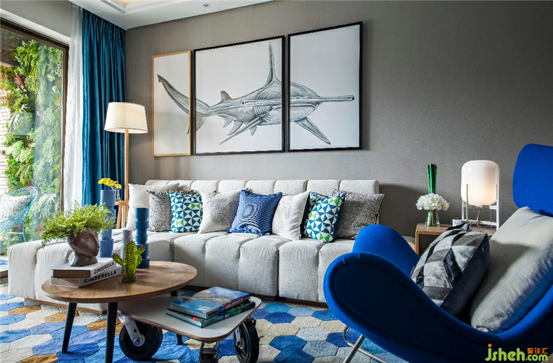 用海洋蓝和米白色为主基调,加以原木色配浅灰色装饰着整个空间。简洁带肌理的壁纸,让空间展现出海洋蓝的魄力和对大自然向往的自由。清新的色彩搭配,不带雕花、纹饰的家具,简洁具功能化更贴近自然。从纹理到颜色都给人一种舒适的人情味,北欧现代的记忆仿佛真实的印刻在每块木板上面。室内设计师